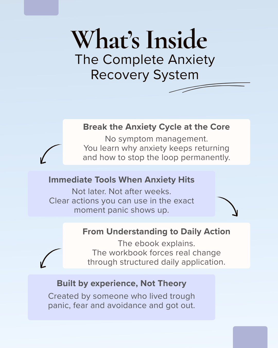 You get the exact steps to use in the moment anxiety takes over, not vague advice.